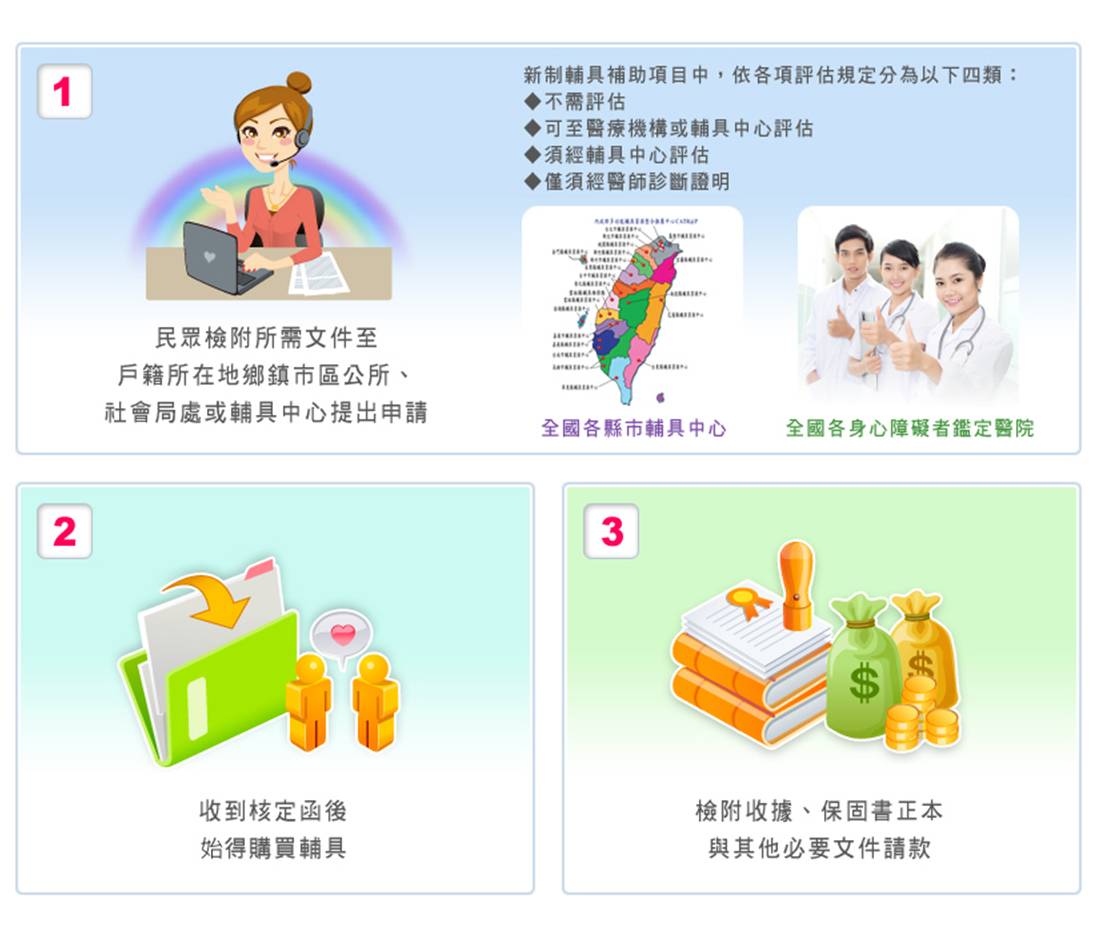 有需求的民眾可至戶籍所在地區公所社會課或戶籍所在地輔具資源中心辦理申請及評估作業。可按照以下三大步驟: