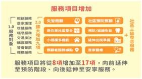 提供補助服務的照管中心將會懸掛統一且顯眼的招牌,讓民眾可以一眼就看到服務單位在哪。另外,政府將全部的服務分成ABC三級,目的是為了整合社區整體的資源與照顧模式,並加強各項服務之間的連結。A級:社區整合型服務中心B級:複合型日間服務中心C級:巷弄長照站