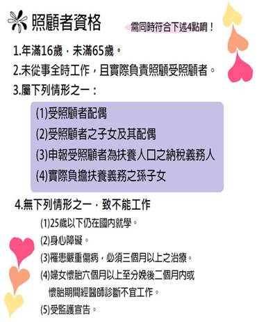 首先,照顧者與受照顧者需設籍及實際居住於同一直轄市、縣(市)。並符合下述《受照顧者資格》以及《照顧者資格》。