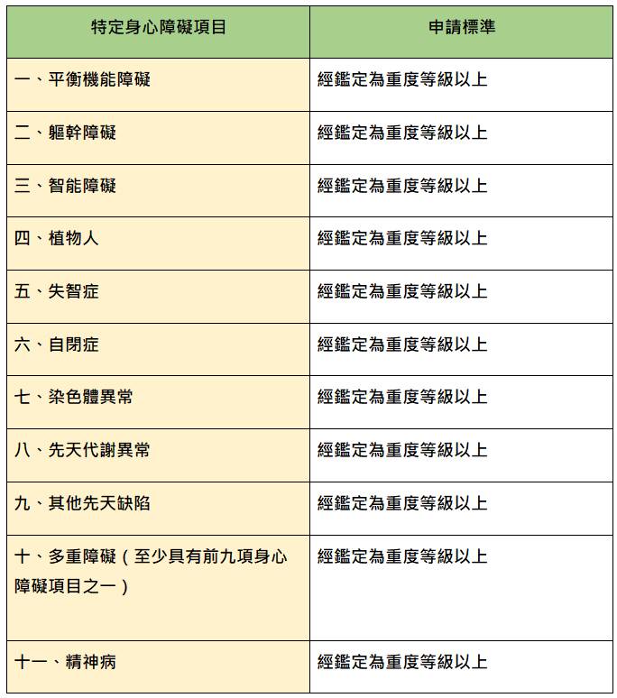 * 前項第二點所定證明文件,得以符合以下特定身心障礙項目及申請標準表之身心障礙手冊影本。