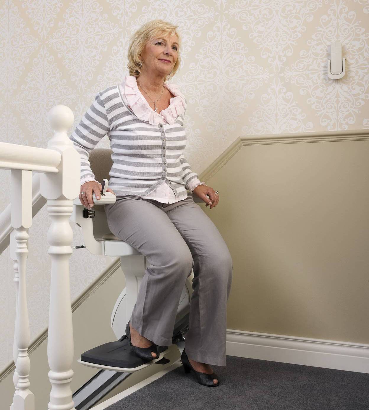 - 樓梯的寬度:想要安裝樓梯升降椅時,樓梯要有一定的寬度始能運行,在考量到乘坐者的舒適度,以及樓梯本身的條件二者的限制下,升降椅的機身厚薄度及軌道的設計就顯得相當重要,也將會影響到樓梯可以安裝的寬度,綜合以上因素,家中的樓梯只要大於61~70公分以上,就能使升降椅正常的運行。