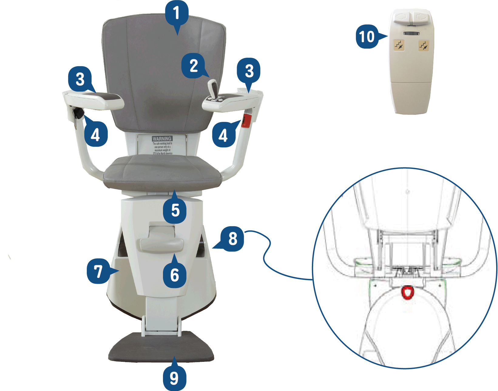 若座椅臨時故障,可拉起緊急扣環,座椅可以向下運行至平面容易下車的位置。